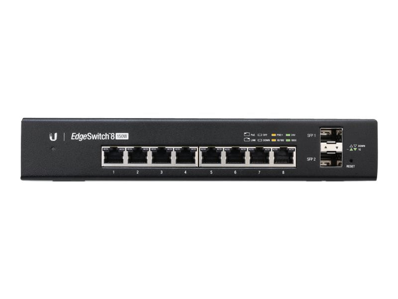 Sharing a total of 150w poe eight gigabit ethernet ports offer 802 3af at poe or 24v passive poe and two sfp ports offer optical connectivity.